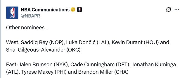 西部:萨迪克-贝(鹈鹕)、东契奇(湖人)、杜兰特(火箭)、亚历山大(雷霆)